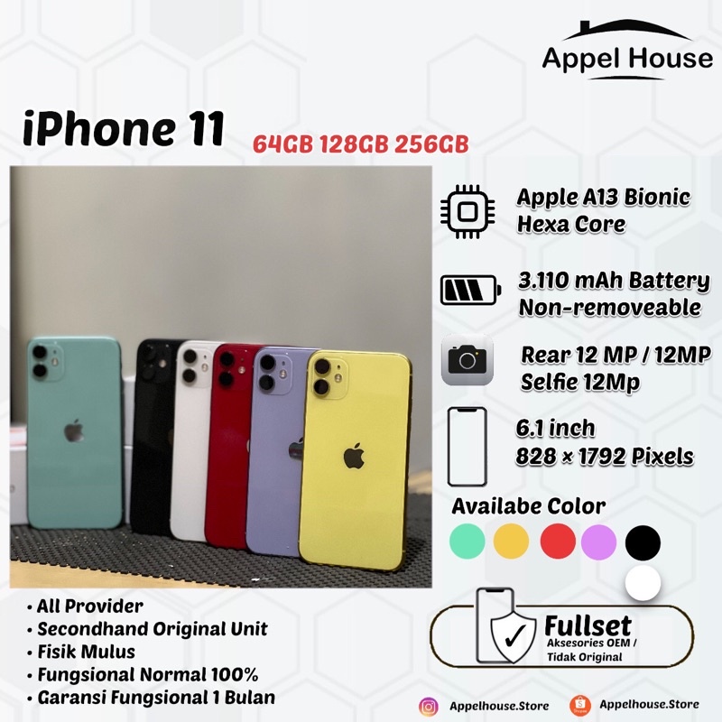 iPhone 11 64GB/128GB/256GB Bekas Original 100% | NORMAL MULUS FULLSET bisa dibeli di harga Rp. 6.850.000,00. Sampai saat ini sudah ada 11839 kali dilihat orang. Dari jumlah tersebut 886 sudah memberi tanda love/suka.